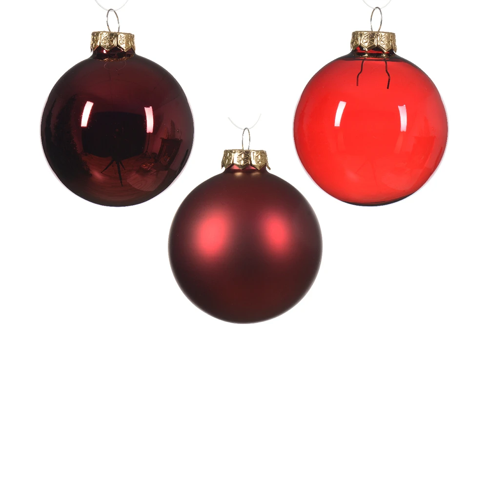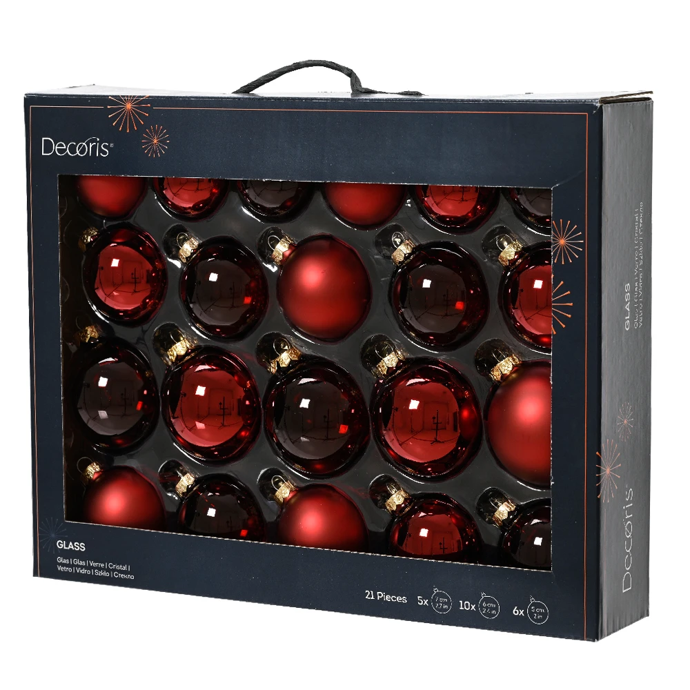 21 steklenih kroglic – rdeča barva d7 cm v treh izvedbah – mat, sijoči in prosojni rdeči barvi. Novoletni okraski so pakirani v priročno škatlo, ki jo boste zlahka shranili za dekoriranje v prihodnjih sezonah. Kroglice so izdelane iz lahkega stekla v tradicionalni obliki z različnimi teksturami.
