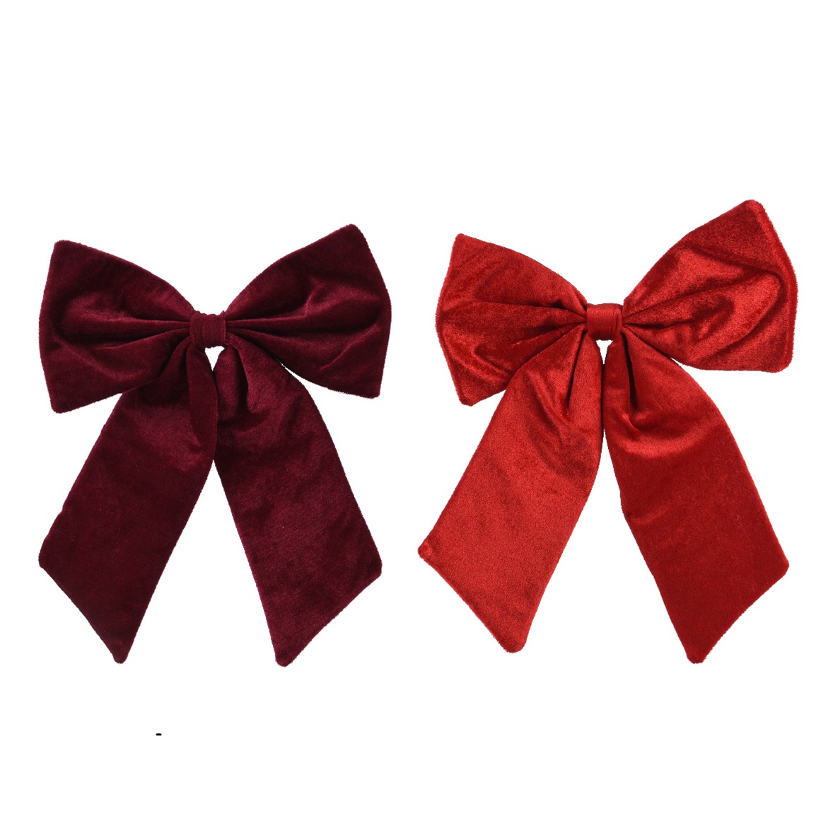 Božična pentlja svetlo ali temno rdeča žametna 30cm 1kos. Okrasek izdelan iz žametnega blaga. Božični okrasek bo v vaš dom prinesel glamurozen praznični sijaj in božično drevo popestril z bleščečim sijajem. Okrasek se bo čudovito dopolnil k tradicionalnim krogličastim oblikam in bo lepo sovpadal s katerokoli drugo božično dekoracijo. Zaradi velikosti takšnih okraskov ne potrebujete veliko, le par na drevo in bo izgled prekrasen.