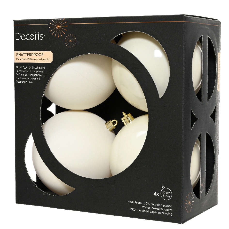 Novoletne kroglice plastika – sijaj in mat bela d10cm 4kosi so čudoviti dodatek prazničnemu sijaju v svojem domu. Vsaka kroglica s premerom 10cm je izdelana iz plastike, odporne na udarce in primerne tako za okrasitev božične jelke kot tudi za dekoracijo prostorov in prazničnih aranžmajev.Kroglice se lepo ujemajo tako z zlatimi ali pa srebrnimi okraski kot tudi z naravnimi in tradicionalnimi barvnimi kombinacijami.