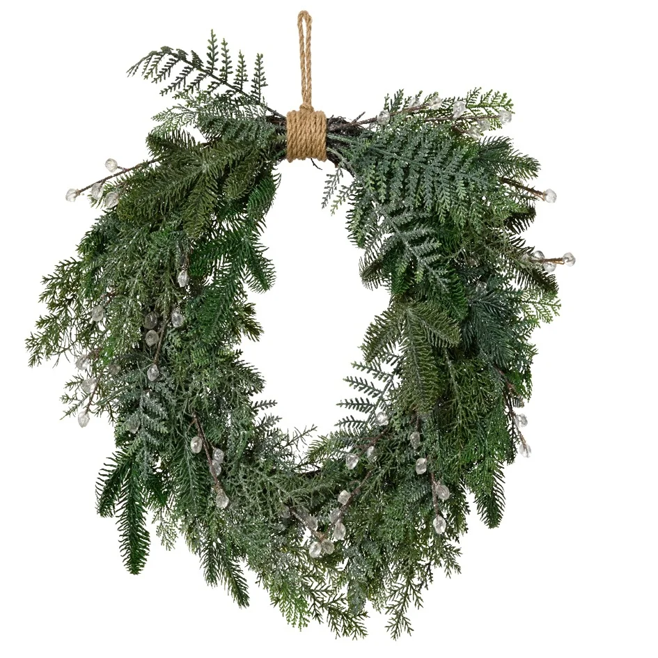 Božični venček Frozen d56cm je izdelan iz različnih umetnih zelenih vej ter dodanimi kamenčki za zamrznjen videz in modernega videza. Odlična novoletna dekoracija za okrasitev mize ali vrat. Primeren je za notranje dekoracije. Na voljo so tudi adventni venčki v drugih dimenzijah in izvedbah.