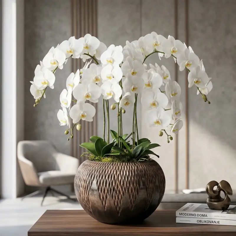 Dimenzije višina 32 cm in premer 45 cm omogočajo, da je lonec primeren za večje rastline, kot so fikusi, palme ali druge dekorativne sobne rastline. Zaradi svoje širine in stabilnosti je lonec tudi odlična izbira za umetne rastline, ki ustvarjajo eleganten dekorativni poudarek v prostoru. Postavite ga lahko ob kavč, v kot sobe, ob vhod ali kot osrednji element notranje dekoracije.