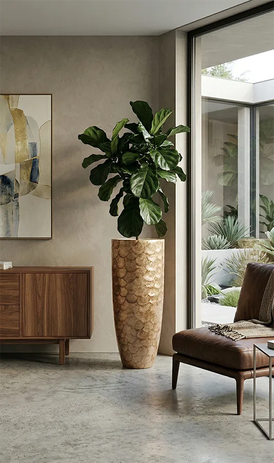Fiberglas lonci so priljubljeni zaradi kombinacije lahkotnosti, trpežnosti in estetske dovršenosti. Okrasni lonec Grand Gold omogoča dolgotrajno uporabo in brezčasno eleganco, ki se odlično poda različnim slogom interierja.