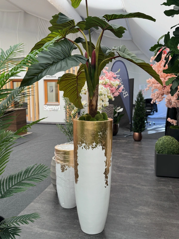 Kolokazija rastlina 160 cm rastlina v lončku ima čudovit naraven videz. Sestavljena je iz precizno izdelanih večjih listov, ki skupaj oblikujejo gostejšo krošnjo, katera ima v srednjem delu tudi plodove. Rastlina je primerna za dekoracijo notranjih poslovnih ali bivalnih prostorov. Umetna rastlina je trenutno pravi trend pri opremljanju prostorov. Liste in steblo prejmete ločeno, liste je potrebno le zatakniti v zgornji del stebla.