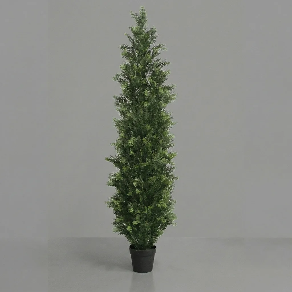 Dekorativna umetna cipresa višine 183 cm posnema naravno strukturo vejic in gostoto krošnje, zato je popolna za oblikovanje zasebnosti, dekoracijo vhodov ali postavitev ob ograje. UV zaščita ščiti rastlino pred bledenjem barve zaradi sonca. To je še posebej pomembno v podnebju Slovenije, kjer so poletja sončna, zime pa vlažne.