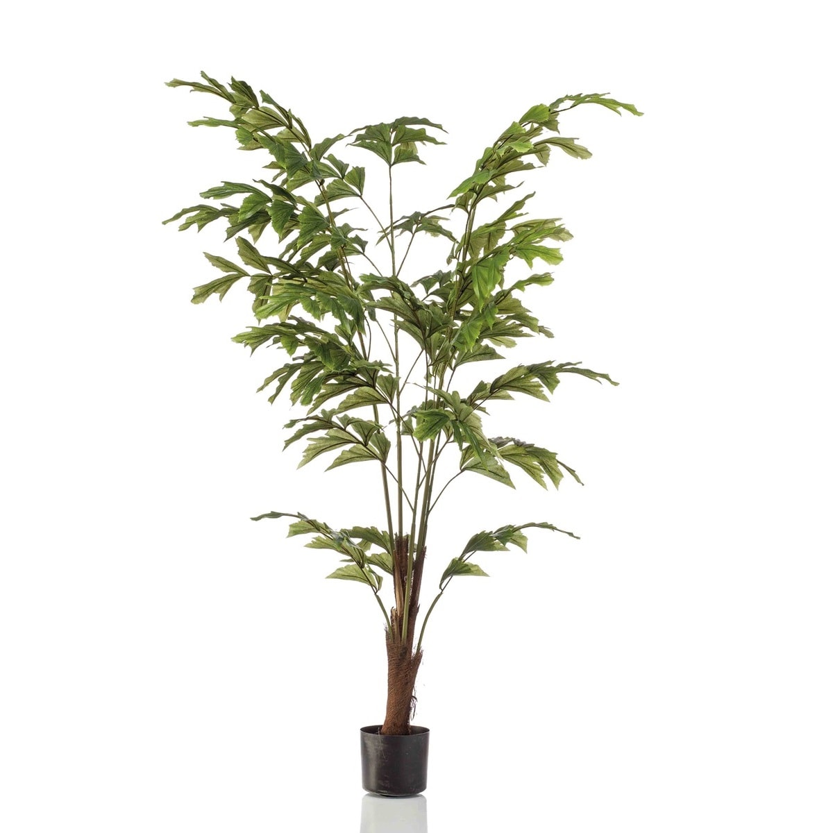 Umetna palma Fishtail 155cm je izdelana iz kakovostnih umetnih materialov, ki ji dajejo pristen naraven videz. Stebla izraščajo iz baze drevesa, konci vej pa so obogateni z gosto krošnjo. Umetna palma Fishtail je prava izbira za popestritev vseh vrst notranjih prostorov, privatnih in tudi poslovnih, saj ne potrebuje vzdrževanja in nikakršnih pogojev za rast.