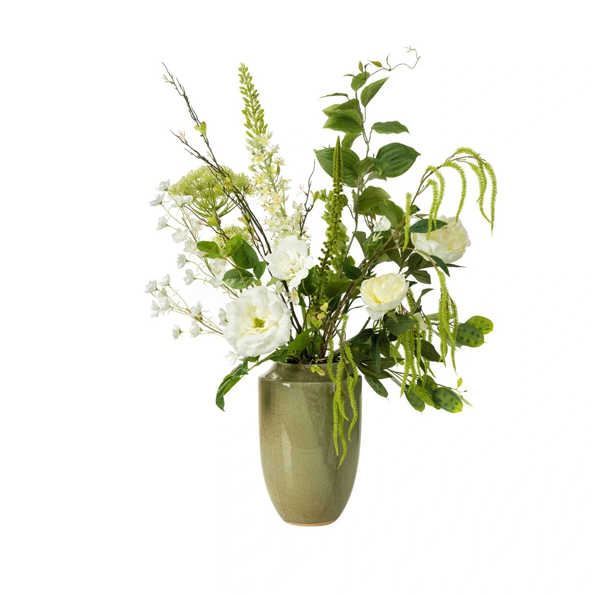 Bogatstvo detajlov in naraven videz. Ta impresiven aranžma odlikuje bogata in premišljena kompozicija. V njem se prepletajo bujni, veliki beli cvetovi, ki spominjajo na razkošne potonike, dopolnjeni z nežnimi, drobnimi belimi cvetličnimi vejicami. Čudovit kontrast čisti belini ustvarja izjemno raznoliko in bogato zelenje. Od elegantno padajočih vejic, ki šopku dodajo gibanje in dinamičnost, do strukturiranih listov ter divjih vejic – vsak element je skrbno izbran, da ustvari vtis svežega, pravkar nabranega cvetja iz pravljičnega vrta.