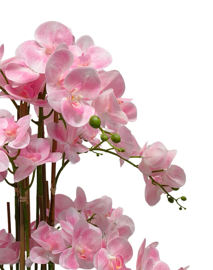 Umetna orhideja roza 80cm Eterna je popolna izbira za vse, ki želite združiti prefinjen dizajn, naraven videz in popolno brezskrbnost. S svojo višino 80 cm predstavlja idealno ravnovesje med kompaktnostjo in opaznim estetskim učinkom. Nežna roza barva cvetov prostoru doda toplino, harmonijo in občutek prestiža.